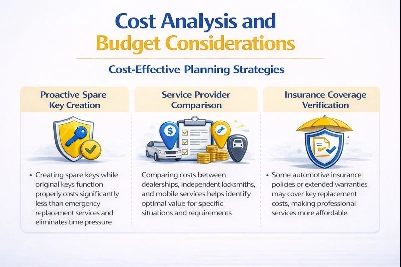 Service Provider Comparison: Comparing costs between dealerships, independent locksmiths, and mobile services helps identify optimal value for specific situations and requirements.