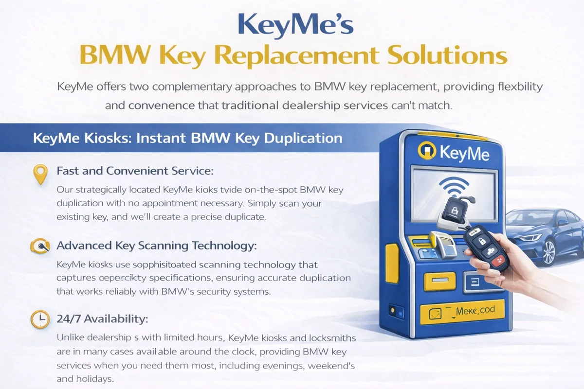 24/7 Availability: Unlike dealerships with limited hours, KeyMe kiosks and locksmiths are in many cases available around the clock, providing BMW key services when you need them most, including evenings, weekends, and holidays.