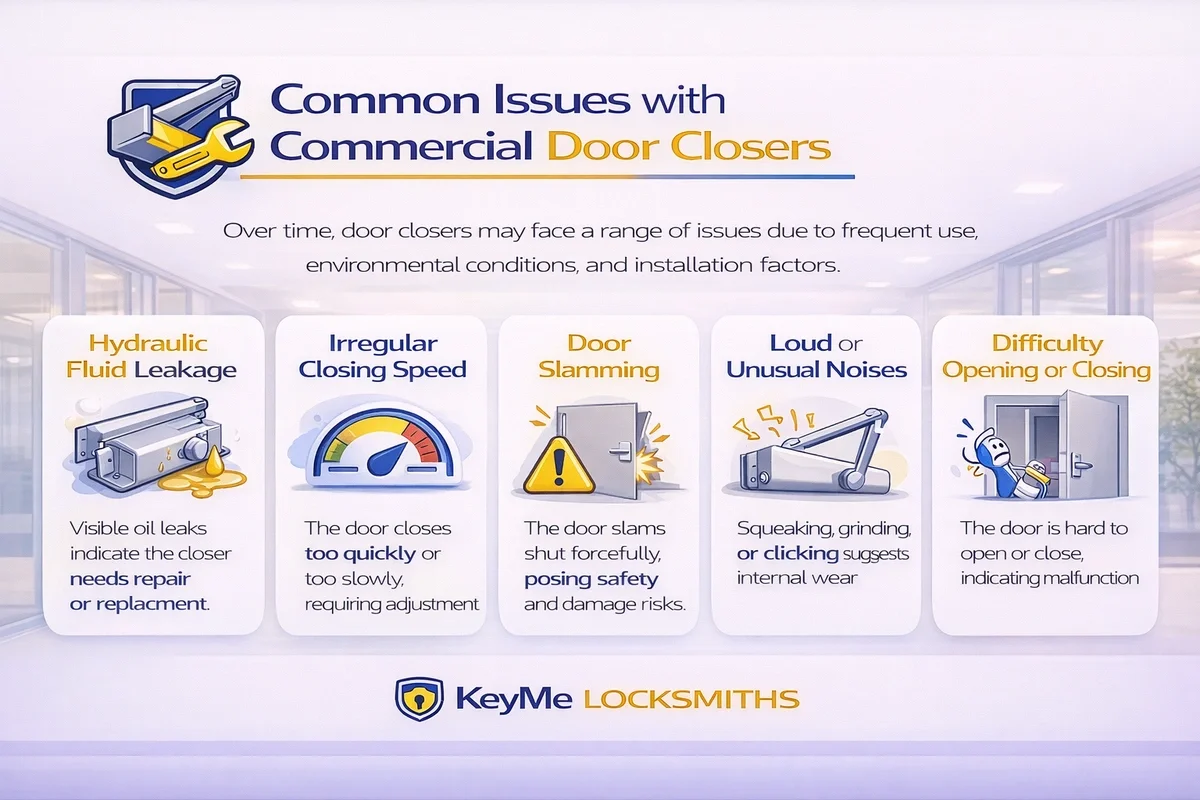 “Regular maintenance of door closers helps businesses avoid premature hardware failure and ensures that doors operate safely for employees and visitors.” - KeyMe Locksmiths