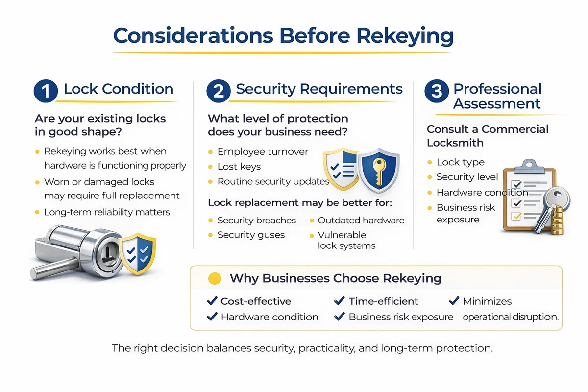Lock Condition: Before deciding on commercial rekeying, it's crucial to assess the condition of the existing locks. Rekeying is most effective when the locks are in good working order. If the locks show signs of wear and tear, changing them might be a more prudent long-term investment.