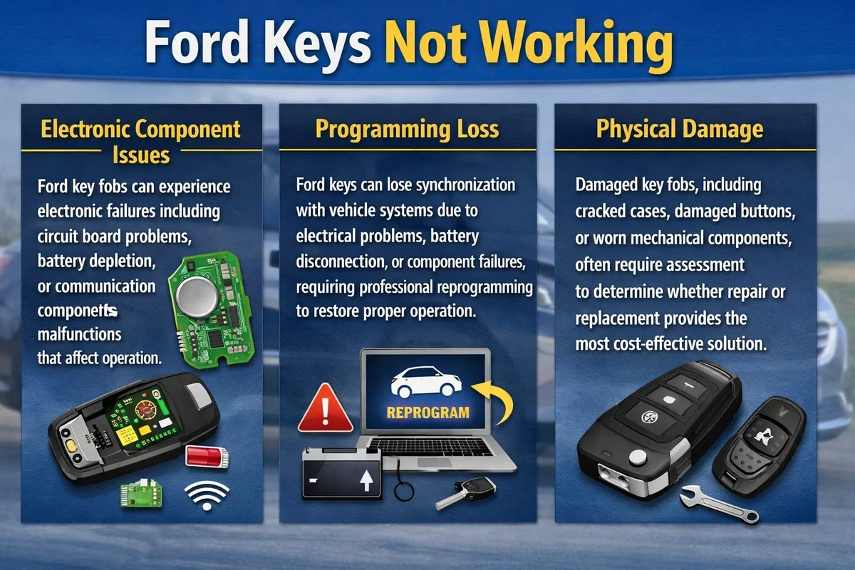 Programming Loss: Ford keys can lose synchronization with vehicle systems due to electrical problems, battery disconnection, or component failures, requiring professional reprogramming to restore proper operation.