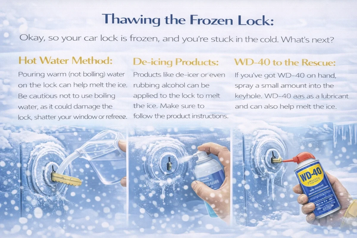 - Hot Water Method: Pouring warm (not boiling) water on the lock can help melt the ice. Be cautious not to use boiling water, as it could damage the lock, shatter your window or refreeze.