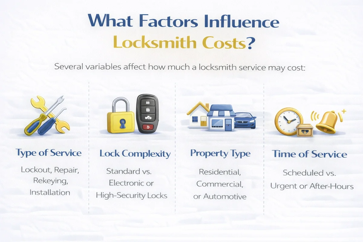 Costs depend on service type, lock complexity, timing, location, and whether parts or programming are required.