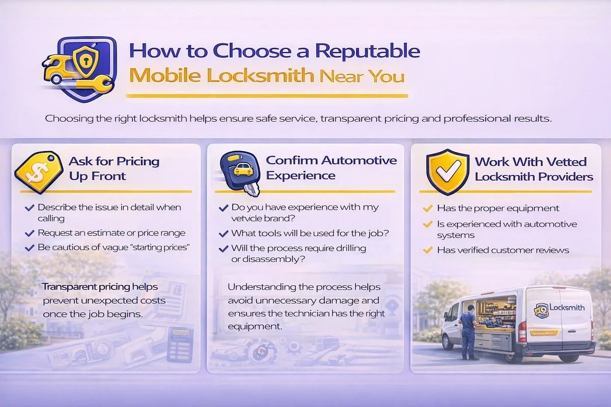 Mobile locksmiths specialize in restoring access to vehicles and solving key-related problems quickly. Because they travel directly to your location, they can often resolve issues faster than traditional repair shops.