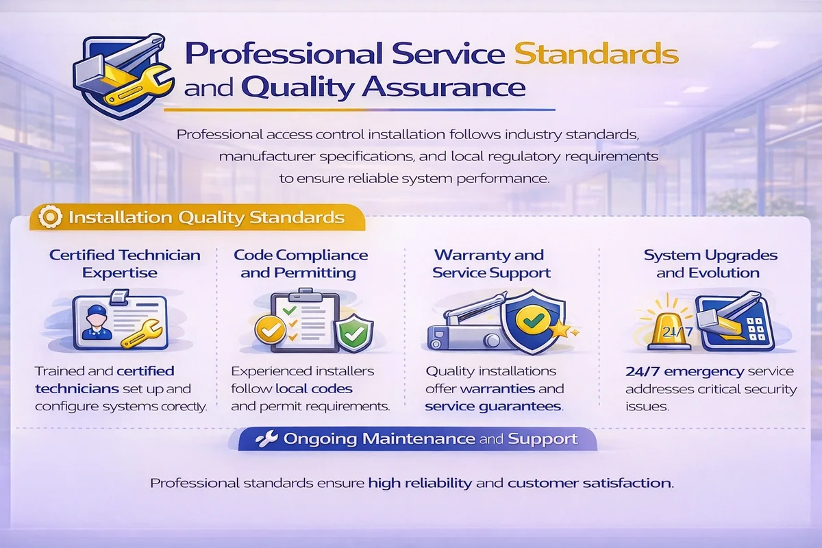 Professional access control installation requires adherence to industry standards, manufacturer specifications, and local regulatory requirements.