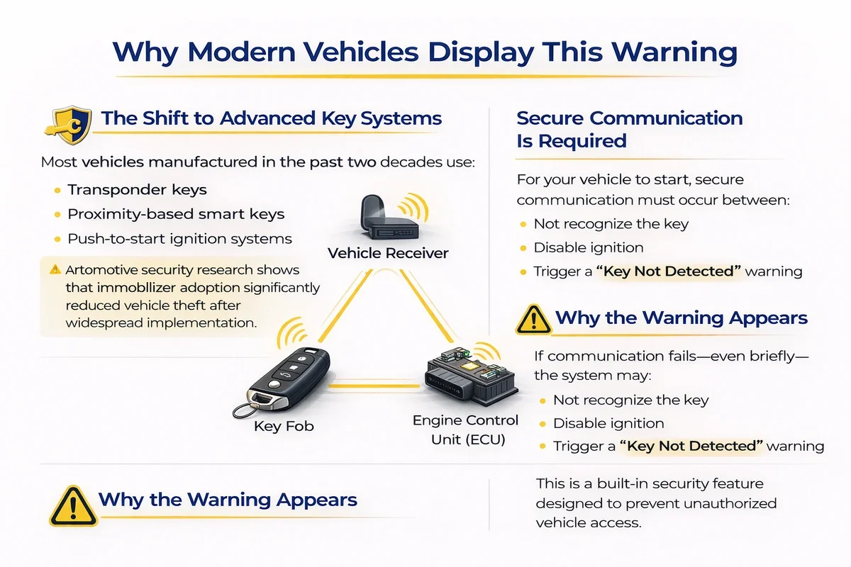 Because modern vehicles rely on electronic authentication to start, even small disruptions can trigger this message.