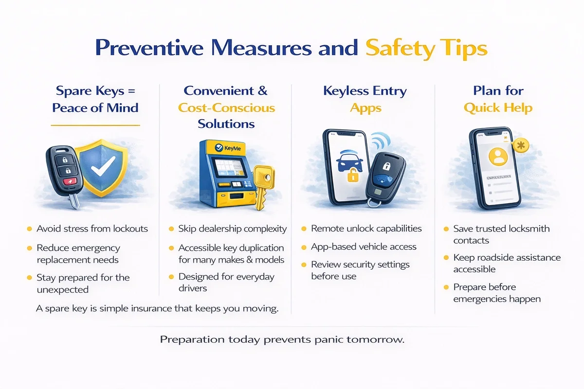 Prevention is the best solution to a locked-out scenario. We'll discuss the importance of keeping a spare key and choosing safe hiding spots for it. Keeping a spare car key is not just a convenient backup; it's a smart investment in peace of mind. Imagine avoiding the stress and expense of being locked out of your vehicle, or the hassle of an emergency key replacement. A spare key is your insurance against such situations, ensuring you're always in control and on the move. At KeyMe we understood that this was simply not an affordable option especially on unique models to have a spare to just sit around - like a thousand dollar bookend. Our mission became to cut out the dealership and so we did, kiosks make cheap car key replacements possible for everyone for most models and makes of vehicles. In today's digital age, keyless entry apps are also becoming increasingly popular, and we'll provide an overview of these apps, including setting up and using them while considering security. Programming emergency contact numbers into your phone can also ensure quick access to help in emergency situations.
