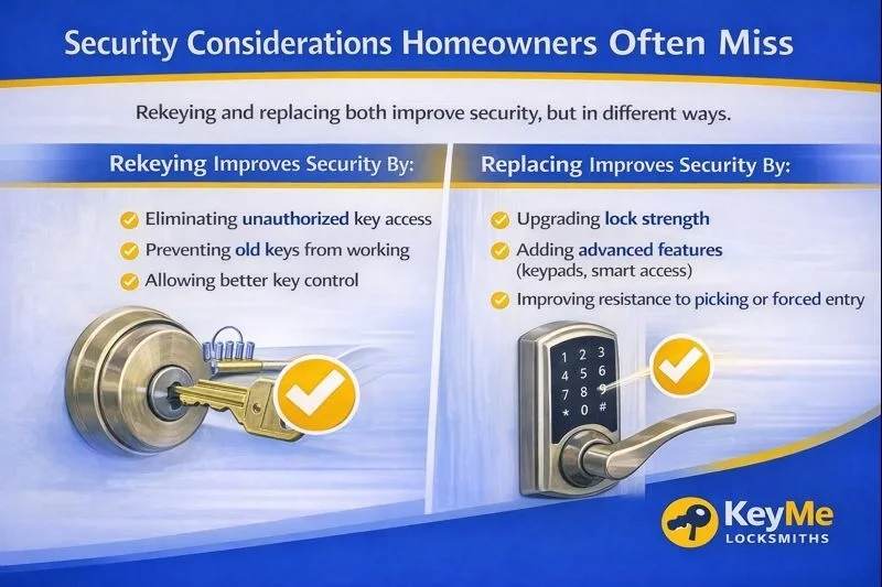 “Many homeowners assume they need new locks when rekeying would fully restore security. Replacing is sometimes necessary, but rekeying is often the smarter first step.” - KeyMe Locksmiths