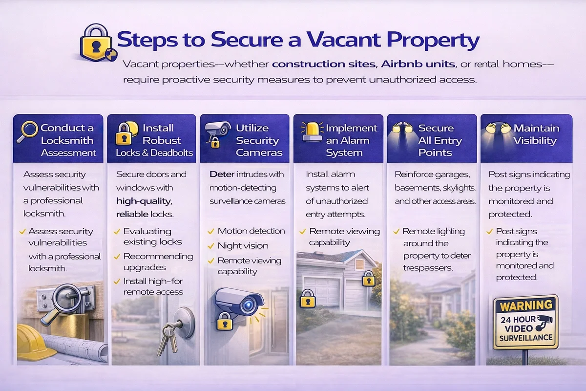 By following these steps, you can significantly reduce the risks associated with vacant properties and ensure they remain secure until they are occupied again. From locksmith assessments to advanced alarm systems, each measure plays a crucial role in safeguarding your property. Remember, proactive security measures not only protect your investment but also provide peace of mind.
