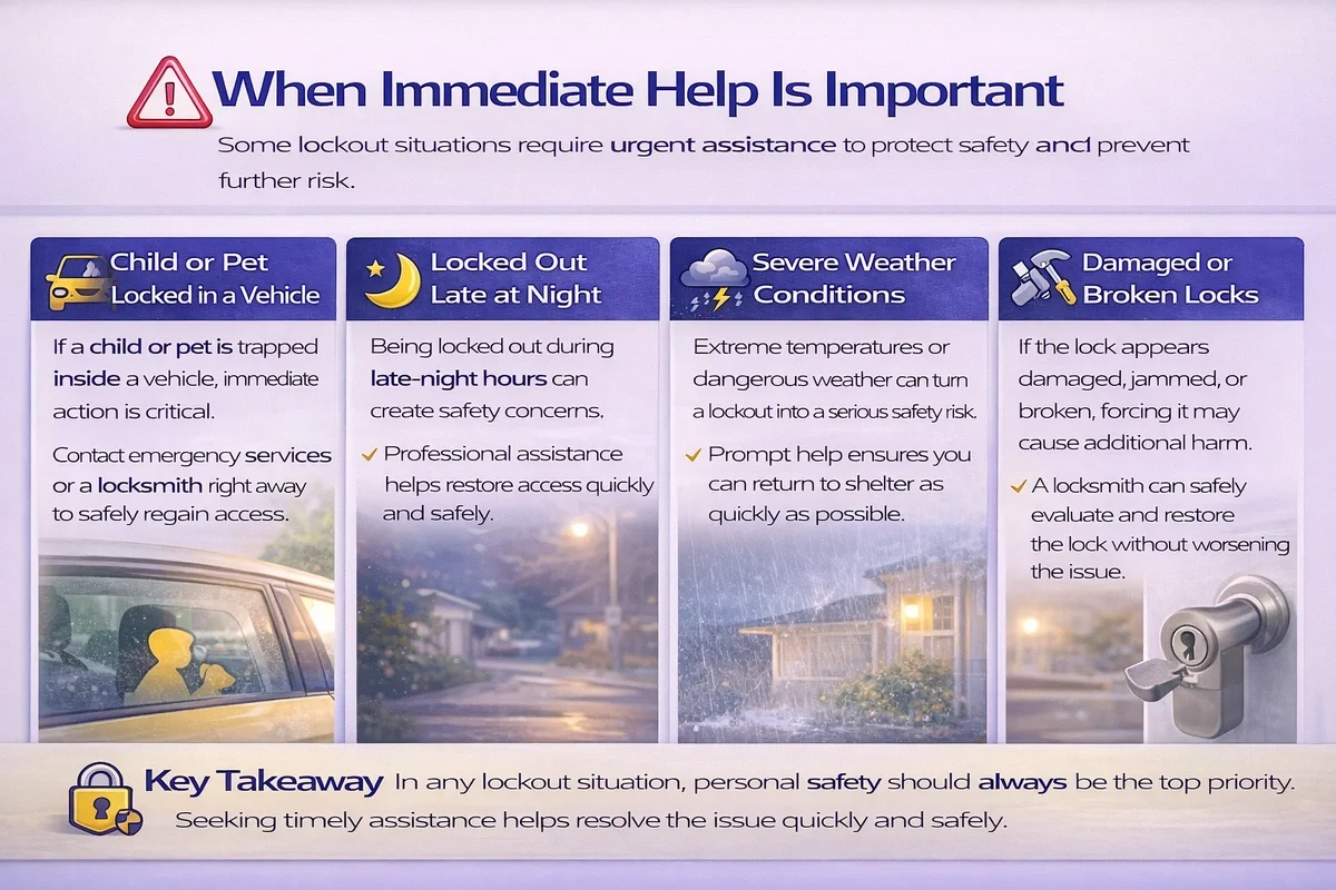If you’re locked out of your home, car, or office, the most important step is to stay calm and assess safe options for regaining access. Many lockouts can be resolved quickly by checking for spare keys, contacting someone with authorized access, or calling a professional locksmith for assistance.