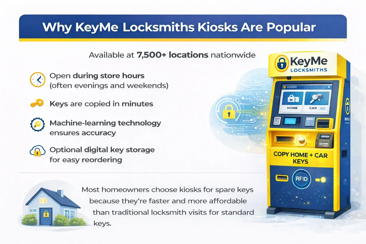 Most homeowners choose kiosks for spare keys because they’re faster and more affordable than traditional locksmith visits for standard keys.